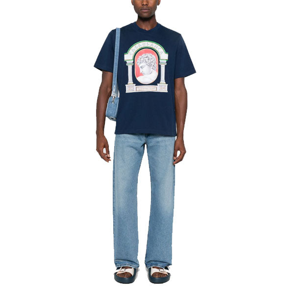 The La Medaille t-shirt is a short-sleeved printed design featuring the house's seasonal artwork, inspired by ancient Greece featuring the house's design element - the arch - depicting columns, a bust, and ancient Greek-style text. Completed with a finely ribbed classic crew neck.